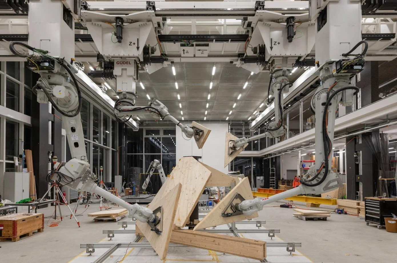 Having arrived at a final design, the construction is being accomplished by another human-automation team: a set of four robotic arms operating with one mind to hold multiple heavy pieces (each pod has dozens) in place while humans apply the resin used to keep them together. It’s a step above the technique we saw used a few years ago by the same team when they used robots as automated assistants.
