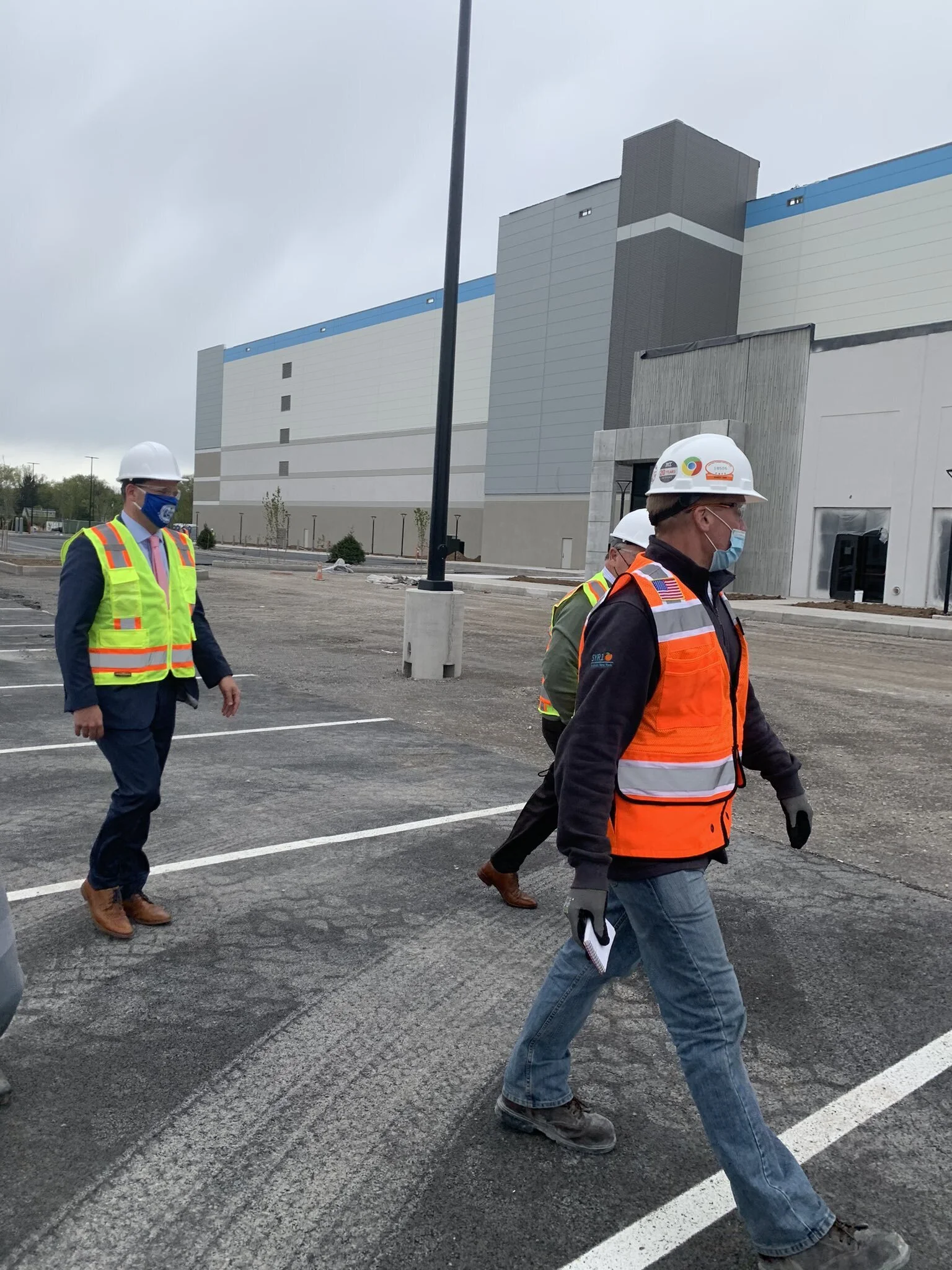 Onondaga County Executive Ryan McMahon, on right wearing yellow vest, tours the Amazon fulfillment center under construction in Clay on Friday, May 7, 2021.