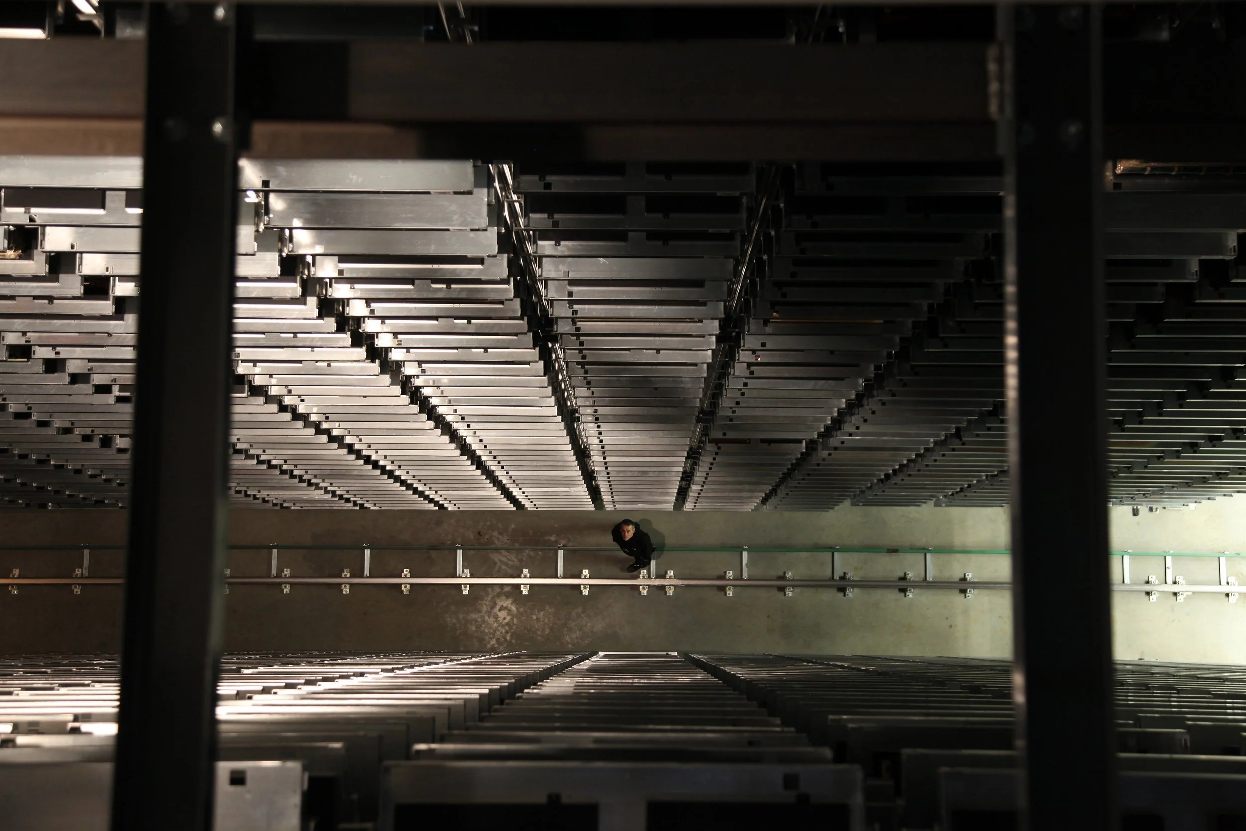 In the dark void of the National Newspaper Building, the robots are afoot. Towering 20 metres high and stretching far into the distance is an imposing expanse of racks, heaving with trays bearing volume upon volume of newspapers, laid flat and strapped between metal sheets. Suddenly, an enormous autonomous crane zooms forwards, stops abruptly and, with a hydraulic gasp, shoots out an arm. Lifting a large metal tray off the scaffold, it deposits it on a conveyor belt and races into the dark. One of three poised for action, it lurks in the gloom, awaiting a command – robots, after all, don’t need the lights on. The tray and its heavy load are whisked away, making a swift right angle at a turntable, and exit through an airlock. A driverless shuttle car then speeds it to a workstation. Somewhere out there a researcher has put in a request, and the machines are on the case.